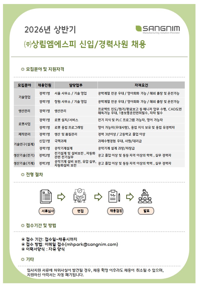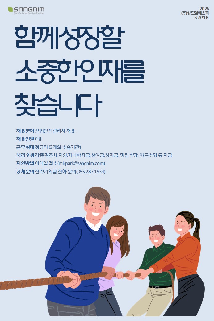 (주)상림엠에스피에서 각 분야의 뛰어난 역량과 경험을 갖춘 유능한 인재를 모십니다. 자신의 전문 역량과 잠재력을 발전시켜 글로벌 리더로 성장해 나갈, 창의적이고 도전적인 여러분들과 상림엠에스피의 더 큰 미래를 함께 만들어 가고자 합니다.